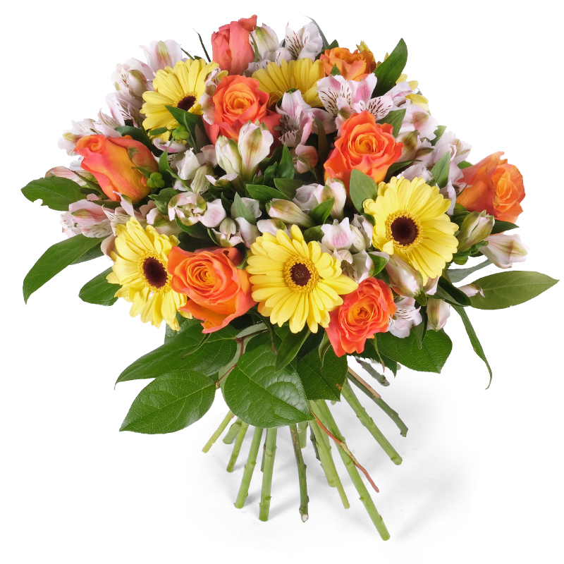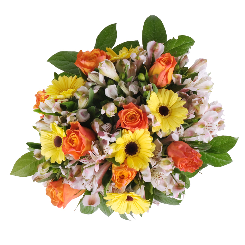 Połączenie klasycznych róż, promiennych gerber i delikatnych alstromerii tworzy kompozycję pełną ciepła i pozytywnej energii. Naturalne liście podkreślają organiczny charakter bukietu. To prezent, który wnosi światło do każdego dnia. Popraw komuś humor!