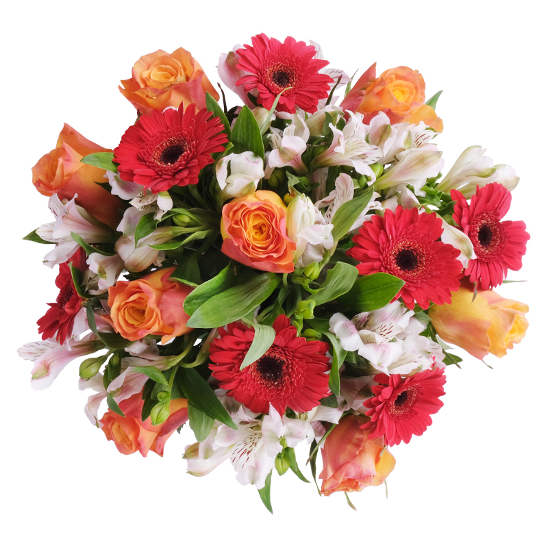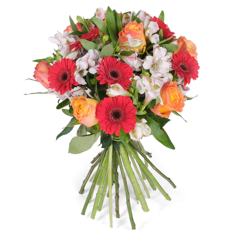 Zawsze świeże kwiaty Bukiet łączący energię z elegancją w doskonałych proporcjach. Róże reprezentują klasę i wyrafinowanie, gerbery wnoszą radość życia, alstromerie dodają subtelności. Kompozycja idealna dla silnych, jak i delikatnych kobiet.