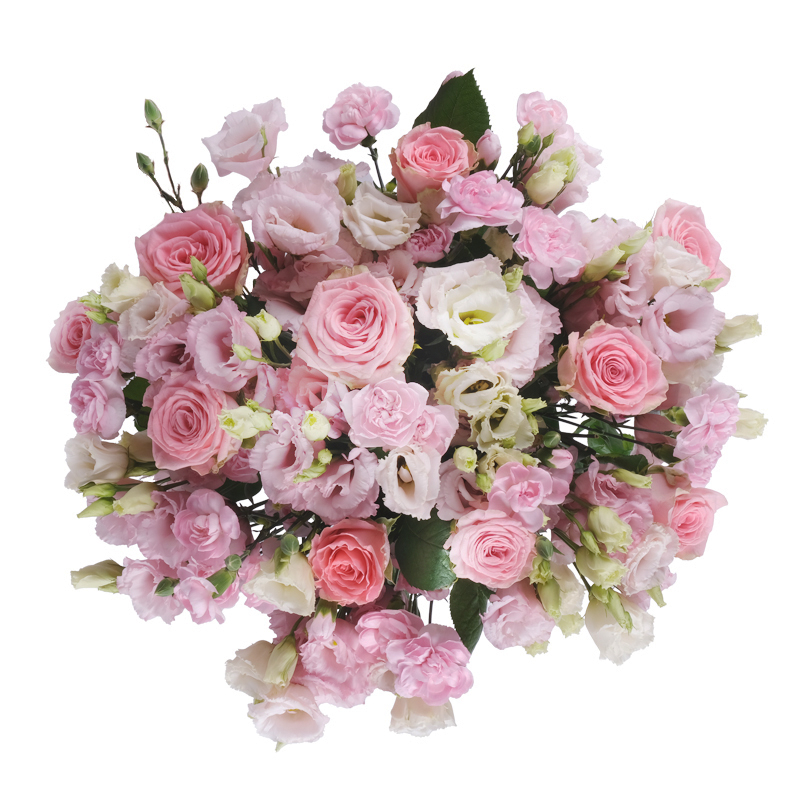 Eustoma, goździk i róża – klasyka w nowoczesnym wydaniu. "Połączenie idealne" w delikatnej kolorystyce różu, z bilecikiem staje się wzruszającym prezentem.